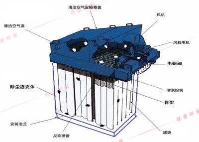 含塵空氣由風(fēng)口進(jìn)入除塵器箱體內(nèi),細(xì)小塵粒由于濾袋的多種效應(yīng)作用,被滯阻在濾袋外壁。凈化后的氣體通過濾袋從上箱體出風(fēng)口排出。隨著使用時(shí)間的增長(zhǎng),濾袋表面吸附的粉塵增多,濾袋的透氣性減弱,使除塵器阻力不斷增大。為保證除塵器的阻力控制在限定的范圍之內(nèi),由脈沖控制儀發(fā)出信號(hào),循序打開電磁脈沖閥,使氣包內(nèi)的壓縮空氣由噴吹管各噴射到對(duì)應(yīng)的骨架(稱為一次風(fēng)),并在高速氣流通過骨架時(shí)誘導(dǎo)數(shù)倍于一次風(fēng)的周圍空氣(稱為二次風(fēng))進(jìn)入濾袋,造成濾袋瞬間急劇膨脹,由于反向脈沖氣流的沖擊作用很快消失,濾袋又急劇收縮,這樣使積附在濾袋外壁上的粉塵被清除。由于清灰是依次分別向幾組濾袋進(jìn)行,并不切斷需要處理的含塵空氣,所以在清灰過程中,除塵器的處理能力保持不變。