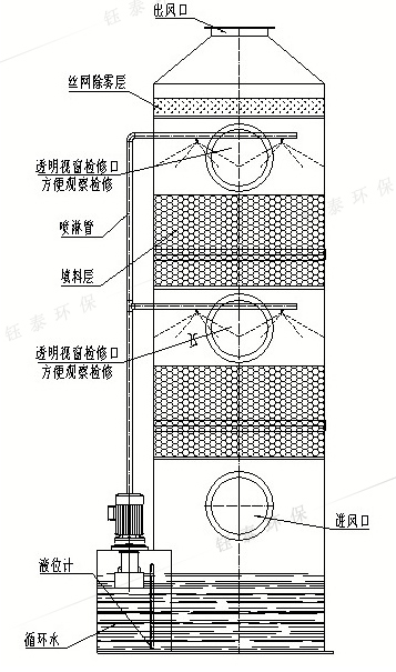 通過(guò)水循環(huán)噴霧,氣體從下方上升,水從上到下循環(huán)過(guò)濾廢氣中的灰塵和雜質(zhì)并通過(guò)中和反應(yīng)和水來(lái)處理廢氣。洗滌器處理酸堿廢氣一般可以達(dá)到90%以上的效果。
