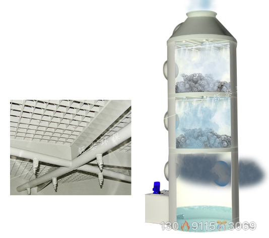 廢氣由風機從風道吸入,并從下至上穿過填料層。循環(huán)吸收器通過高效噴嘴由頂部噴嘴均勻地噴入填料層,并沿填料層表面向下流動,進入循環(huán)水箱。由于填料中吸收劑的上升和下降恒定接觸,在上升的氣液濃度越來越低,到塔頂時滿足排放要求的液體在重力作用下流入儲液罐,并由循環(huán)泵排出循環(huán)。