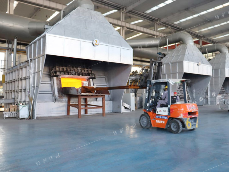 再生鋁雙室爐煙氣處理系統(tǒng)采用XLP高效旋風(fēng)除塵器+強(qiáng)制排風(fēng)冷卻器+脈沖布袋除塵器組成,雙室爐爐門排煙采用2個排煙罩,2個爐門罩交替打開;并配套爐膛排料輔助排煙系統(tǒng),1套雙室爐煙氣處理系統(tǒng)處理風(fēng)量≥130000m3/h。除塵器運(yùn)行后將雙室爐燃燒過程產(chǎn)生的高溫?zé)煔猓囟龋?50℃)和爐門罩排出的煙氣全部收集干凈,保證了工人的操作環(huán)境,達(dá)到了規(guī)定的排放標(biāo)準(zhǔn),給生產(chǎn)企業(yè)帶來了巨大的經(jīng)濟(jì)效益。除塵器收集的顆粒污染物主要是熔煉過程中產(chǎn)生的金屬氧化物和非金屬氧化物,還有大量碳?;曳莸龋龎m脫硫后:煙塵濃度:≤10mg/m3。
